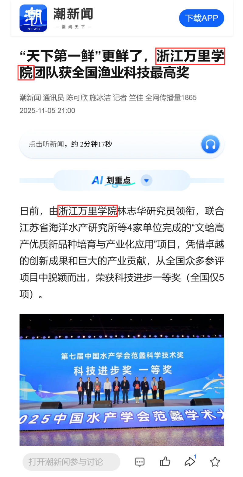 《潮新闻》“天下第一鲜”更鲜了,浙江万里学院团队获全国渔业科技最高奖